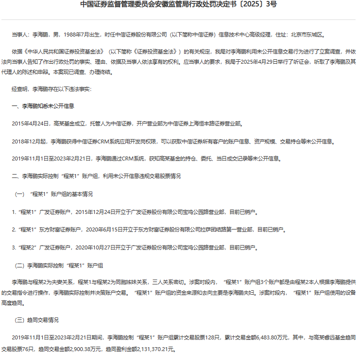 安徽证监局5月30日披露的行政处罚决定书〔2025〕3号显示,依据《中华人民共和国证券投资基金法》(以下简称《证券投资基金法》)的有关规定,安徽证监局对时任中信证券股份有限公司(以下简称中信证券)信息技术中心高级经理李海鹏利用未公开信息交易行为进行了立案调查,并依法向当事人告知了作出行政处罚的事实、理由、依据及当事人依法享有的权利。应当事人的要求,于2025年4月29日举行了听证会,听取了李海鹏及其代理人的陈述和申辩。本案现已调查、办理终结。