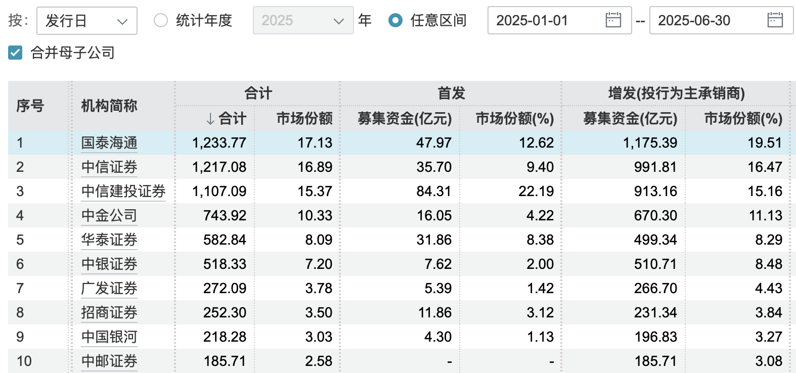 从上半年的股权承销金额排名来看,在国泰海通完成吸收合并后,头部券商的投行格局正在重塑。