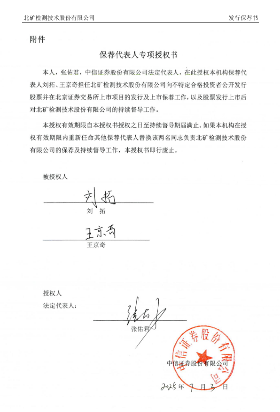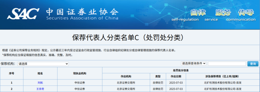 2025年7月3日,中信证券两名保荐代表人刘拓(证券执业编号:S10107****0001)和王京奇(证券执业编号:S10107****0002)因北矿检测技术股份有限公司(以下简称“北矿检测”)北交所IPO项目被中国证券业协会列入C类保代名单,受到自律处罚。同日,两人在北矿检测招股书(上会稿)上签字,刘拓和王京奇“最近3年内未受监管措施或自律处分”。