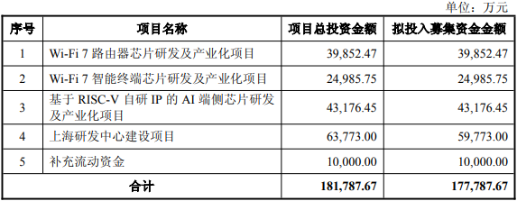 乐鑫科技于2025年7月3日发布的2025年度向特定对象发行A股股票募集说明书(申报稿)显示,本次向特定对象发行股票募集资金总额不超过人民币177,787.67万元(含本数),扣除发行费用后的净额拟投资于以下项目:Wi-Fi7路由器芯片研发及产业化项目、Wi-Fi7智能终端芯片研发及产业化项目、基于RISC-V自研IP的AI端侧芯片研发及产业化项目、上海研发中心建设项目、补充流动资金。
