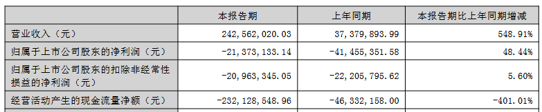 2025年1-6月,公司实现营业收入2.43亿元,同比增长548.91%;归属于上市公司股东的净利润为-2,137.31万元,上年同期为-4,145.54万元;归属于上市公司股东的扣除非经常性损益的净利润为-2,096.33万元,上年同期为-2,220.58万元;经营活动产生的现金流量净额为-2.32亿元,上年同期为-4,633.22万元。