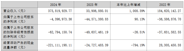 2022年至2024年,公司营业收入分别为1.85亿元、3,390.69万元、3.76亿元,归属于上市公司股东的净利润分别为-3,658.69万元、-4,457.14万元、-439.70万元,归属于上市公司股东的扣除非经常性损益的净利润分别为-3,763.16万元、-4,963.75万元、-6,279.42万元,经营活动产生的现金流量净额分别为2,830.55万元、-2,472.75万元、-2.21亿元。