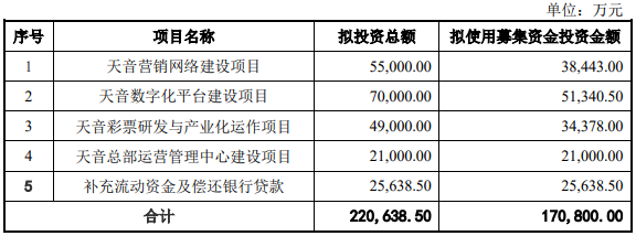 天音控股于6月4日发布的《2023年度向特定对象发行A股股票募集说明书(修订稿)》显示,公司本次向特定对象发行A股股票拟募集资金总额不超过170,800.00万元(含本数),扣除发行费用后,募集资金拟投资于以下项目:天音营销网络建设项目、天音数字化平台建设项目、天音彩票研发与产业化运作项目、天音总部运营管理中心建设项目、补充流动资金及偿还银行贷款。