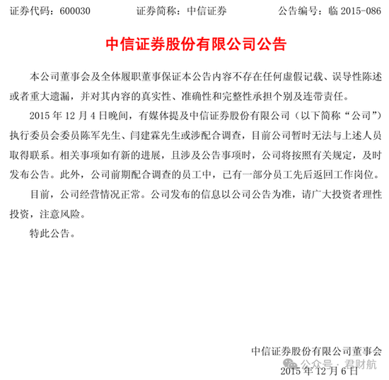 2015年12月, 中信证券 曾公告称,公司执行委员会委员陈军等人“暂时失联”,当时有媒体称两人正在协助调查。