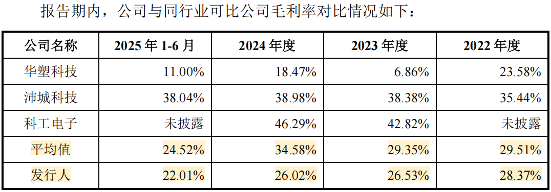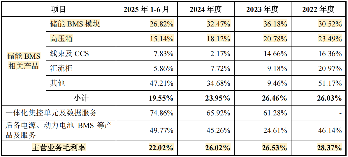 2022-2024年公司主营业务毛利率分别为28.37%、26.53%和26.02%,2025年上半年骤降至22.02%,公司称主要系“毛利率较高的BMS模块产品售价及销售收入占比下降”所致。