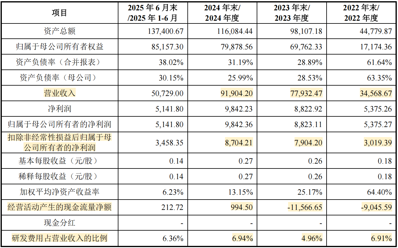 2022-2024年,公司营业收入分别为3.46亿、7.79亿和9.19亿元,扣非后归母净利润分别为0.30亿、0.79亿和0.87亿元。2025年1-6月,公司营业收入5.07亿元,扣非后归母净利润0.35亿元。