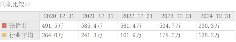 根据披露,2020年-2024年,张佑君年薪分别为491.5万元、585.4万元、561.4万元、504.7万元、230.33万元。