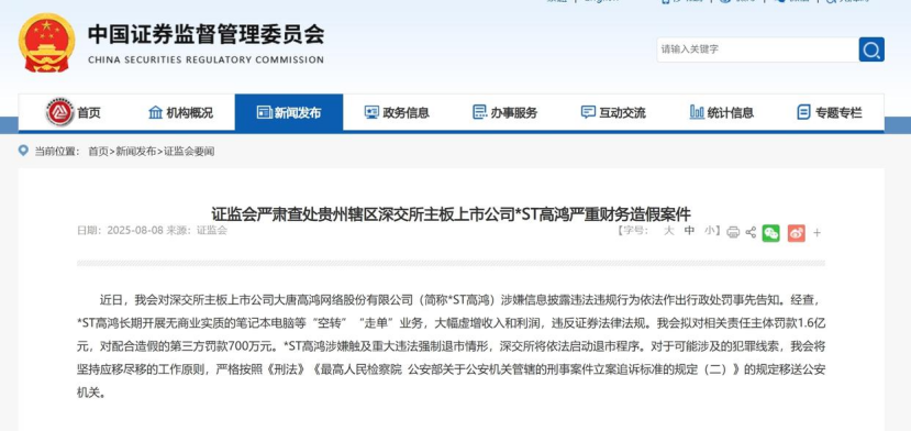 2025年,监管部门对财务造假行为的打击力度空前,多家上市公司因长期系统性造假领到千万元级甚至亿元级罚单。*ST高鸿成为年内被罚金额最高的上市公司,经查,该公司在2015年至2023年间,通过组织、参与无商业实质的虚假贸易业务,累计虚增营业收入和利润总额,涉及欺诈发行等多项严重违法行为。2025年8月,证监会对相关责任主体合计罚款1.6亿元,其中上市公司自身被罚1.35诈发行罚款1.25亿元,为非法募资额的10%),配合造假的第三方南京庆亚及实控人江庆被罚700万元,公司董事长付景林被罚750万元并被市场禁入10年,时任财务总监丁明锋被罚600万元并被市场禁入5年。