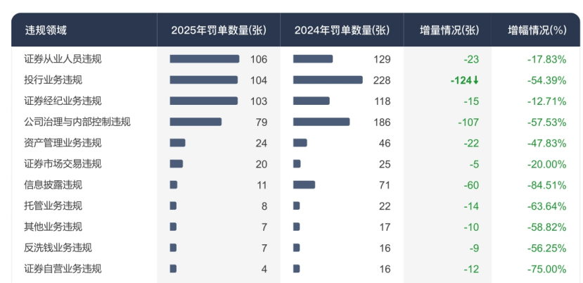 作为资本市场的核心中介与“看门人”,券商行业的合规水平直接关系市场交易秩序与投资者权益。据数据统计,2025年监管部门共对证券机构及从业人员开出388张罚单,较2024年度减少41.48%,但罚没金额攀升至2.08亿元,同比增长63.57%,其中机构被罚没1.73亿元,个人被罚没3495.38万元。