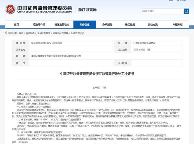 在个人处罚方面,监管力度依然不减。2025年11月3日,浙江证监局决定依据《基金法》《私募监管条例》《证券市场禁入规定》,对林艺平责令改正,给予警告,没收违法所得8857.69万元,并处以8857.69万元的罚款,同时对其采取5年证券市场禁入措施。