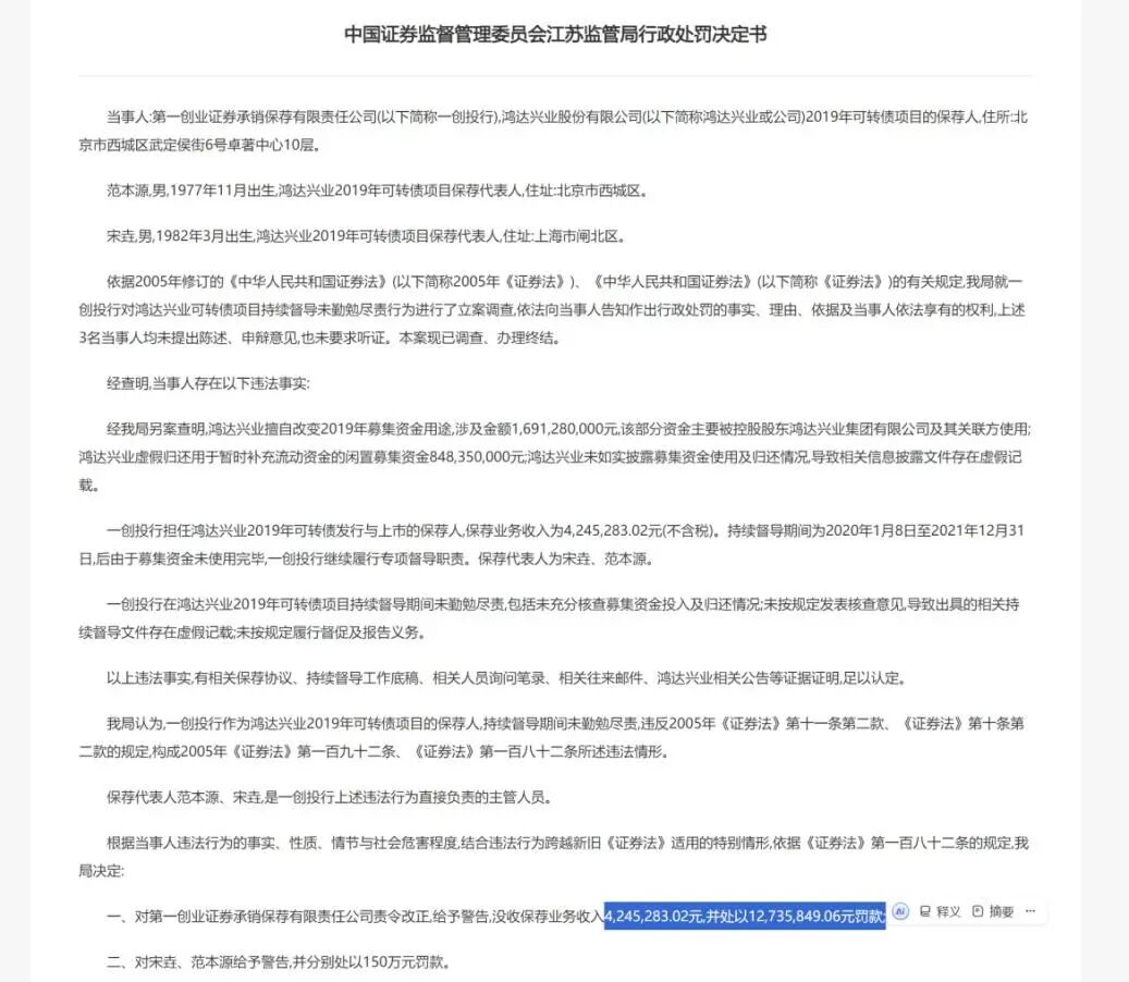 其中,第一创业证券承销保荐有限责任公司因保荐业务违规领到高额罚单,该公司在鸿达兴业可转债项目后续督导期间,未发现鸿达兴业擅自改变近17亿元募集资金用途、虚假归还募集资金等问题,导致其持续督导意见存在虚假记载。据公开信息显示,2025年12月24日,江苏证监局对其作出处罚,没收业务收入约424.5万元,并处以约1273.6万元罚款,合计罚没约1698万元,两名保荐代表人宋垚、范本源分别被处以150万元个人罚款。