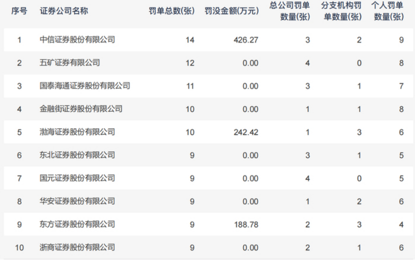 数据显示,中信证券以14张罚单的数量成为全年受罚次数最多的券商,其罚没金额为426.27万元,主要处罚类型为出具警示函。此外,五矿证券、国泰海通证券等9家券商均以9张及以上罚单数量进入受罚次数前十名单,其中7家券商罚没金额为0元,以行政监管措施为主。业内人士分析,这种“高频次低金额”与“低频次高金额”并存的现象,体现了监管“抓早抓小”与“重典治乱”相结合的思路,既对轻微违规行为及时警示,又对重大违法违规行为严厉打击。