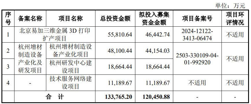 易加增材原拟在上交所科创板发行股票数量不超过2,922.2079万股,且占发行后总股本的比例不低于25%,不涉及股东公开发售。易加增材原拟募集资金120,450.88万元,用于北京易加三维金属3D打印扩产项目、杭州增材制造设备产业化项目、杭州研发中心建设项目、技术服务网络建设项目。
