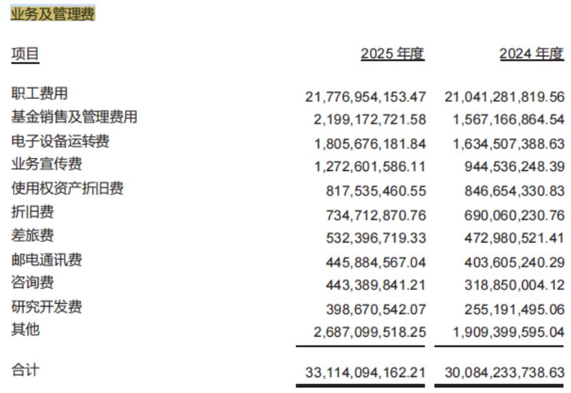 营业支出上,2025年,中信证券营业支出346.89亿元,同比增长17.14%,主要是业务及管理费变动所致。业务及管理费为331.14亿元,同比增长约10%。