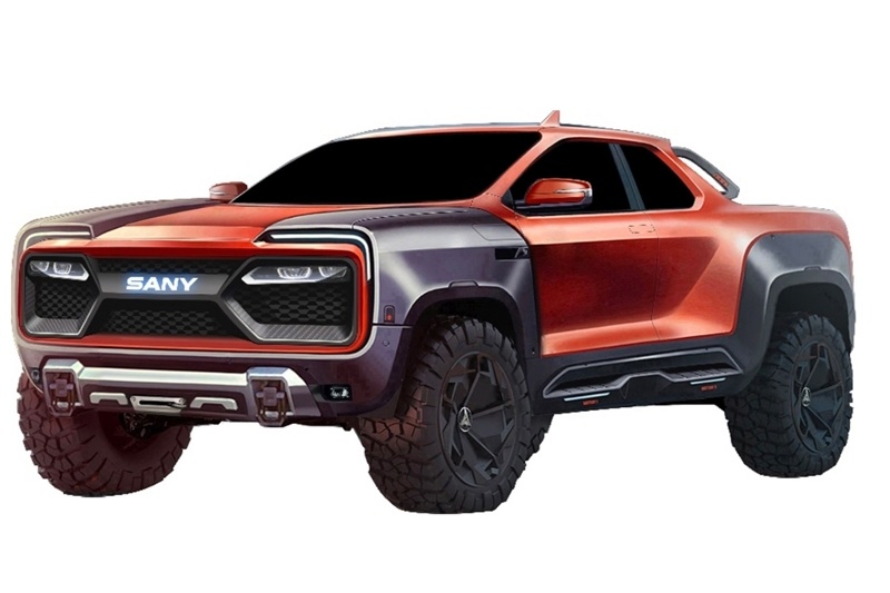 和之前专利的科技感不同,新产品更注重营造越野氛围,宽大且饱满的车头拥有一种美式皮卡的气息。灯组采用分体式设计,中部为SANY字样,两侧为日行灯,预计点亮后非常醒目。撞色式车头自带一股狂放不羁气质,车头机盖两侧也进行了隆起,非常具有未来感。