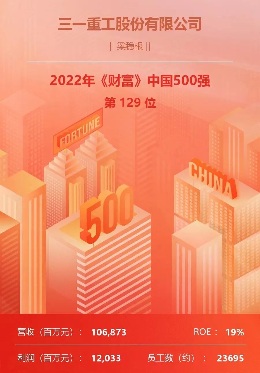 7月12日,2022年《财富》中国500强排行榜重磅出炉,上市公司三一重工以1068.73亿元的营业总收入位列榜单第129名,稳居工程机械行业第一。