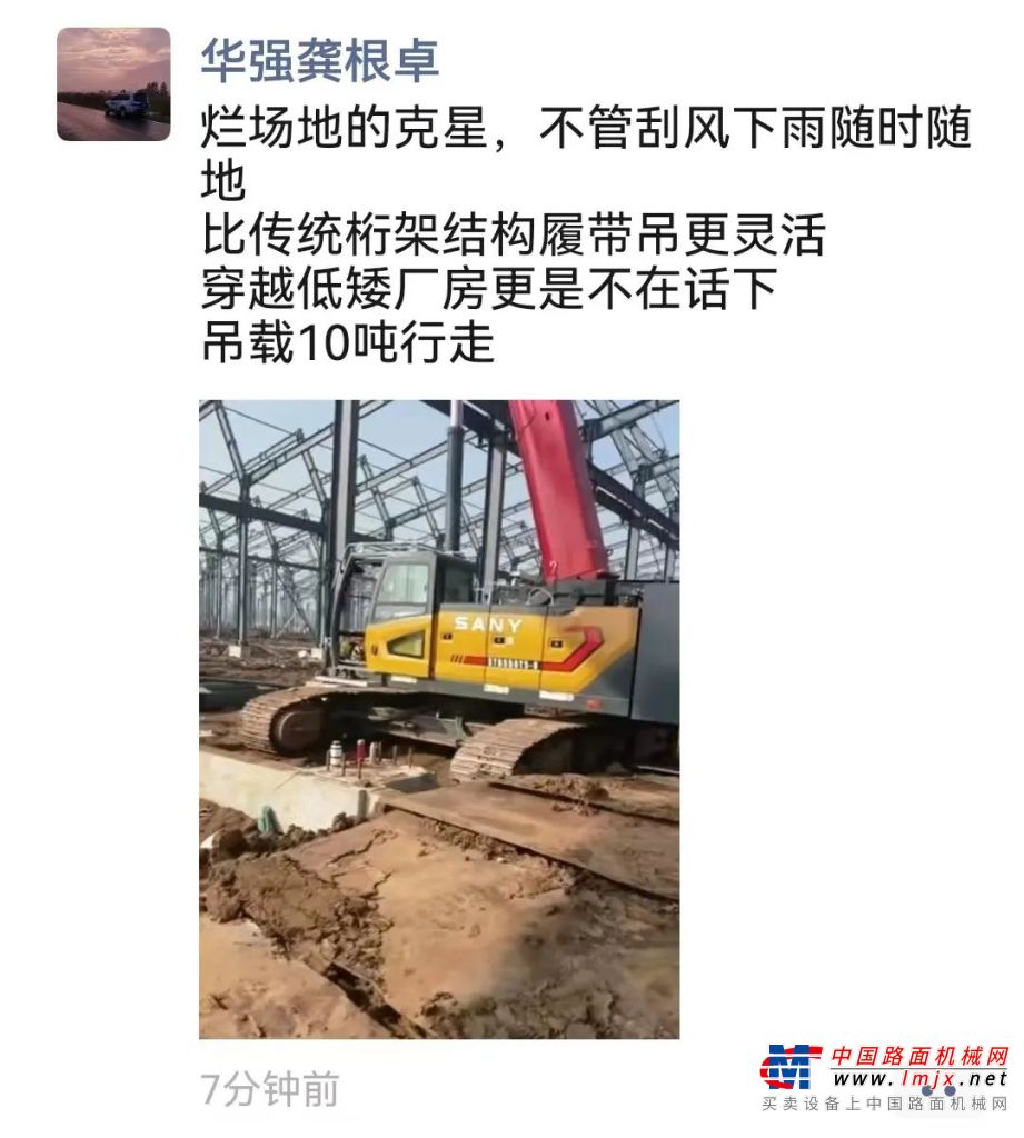 经过一段时间的实际使用,龚根卓对这台设备评价颇高,他在朋友圈里写到:“烂场地的克星,不管刮风下雨随时随地吊载10吨行走,比传统桁架结构履带吊更灵活,穿越低矮厂房更是不在话下。”