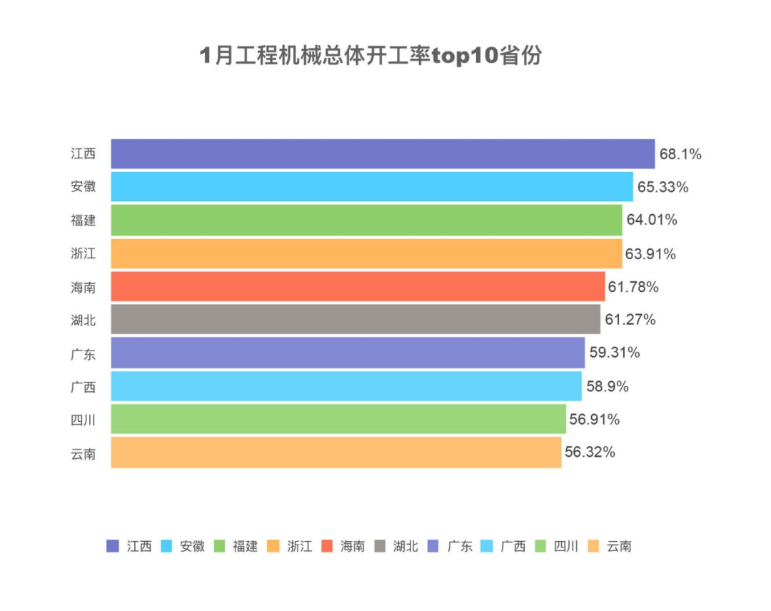 1月份,西部地区堆高机开工率45.71%、正面吊开工率44.84%,均位居全国第一。宁夏压路机工作量同比增幅78.08%,位居全国第一;西藏泵车工作量同比增幅40.00%,位居全国第一。