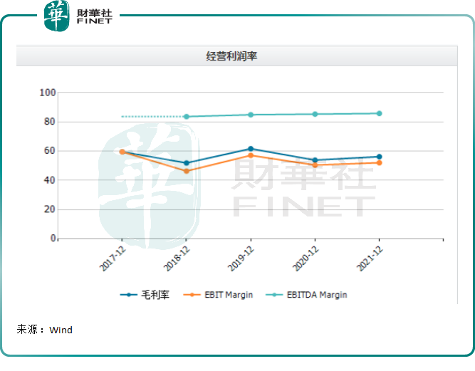 从近五年表现看,公司毛利率一直稳定在50%以上,其中2019年超过61%,2021年则也会56%。销售净利率也表现较好,2019年超30%,2021年则约为24%。