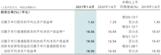 2021年1-6月,招商银行归属于公司普通股股东的加权平均净资产收益率为18.06%,比上年同期增加1.12个百分点;扣除非经常性损益后归属于公司行普通股股东的加权平均净资产收益率为18.00%,比上年同期增加1.08个百分点。