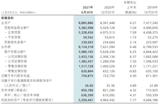 截至2021年6月30日,招商银行的总资产为88858.86亿元,比上年末增长6.27%,其中贷款和垫款总额为53829.98亿元,比上年末增长7.04%;总负债为81243.18亿元,比上年末增长6.46%,其中客户存款总额为59801.65亿元,比上年末增长6.25%。