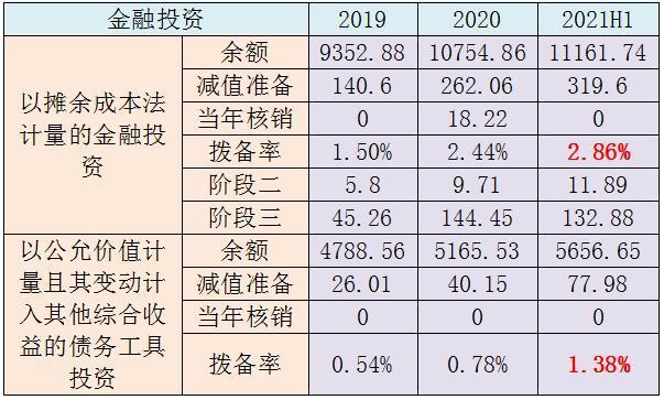 通过表1可以看到,这三项的拨备率在2019年和2020年年报基本在0.11%-0.36%之间波动,但是到了2021年半年报,3项的拨备率都有显著提升,特别是后两项,提高了1-3倍。