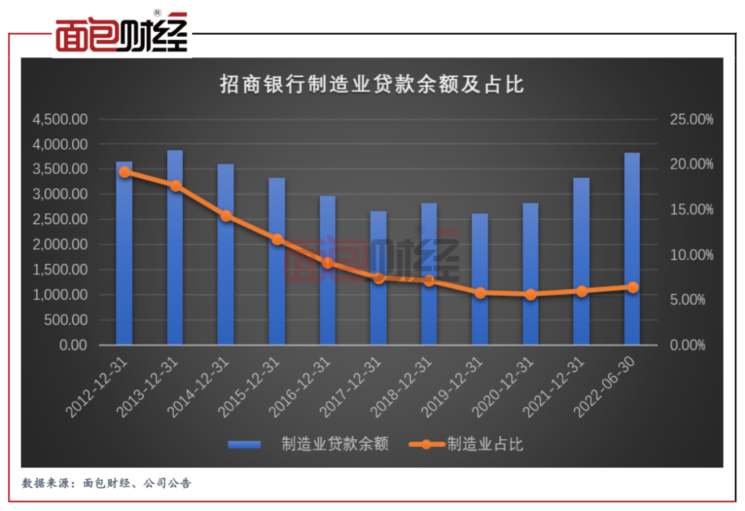 招商银行2022年上半年制造业贷款占比有所上升,但仍处于行业较低水平。