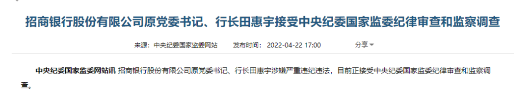 4月18日,招商银行免去招商银行行长田惠宇党委书记一职,并称“另有任用”。不到一周,田惠宇就被相关部门调查。