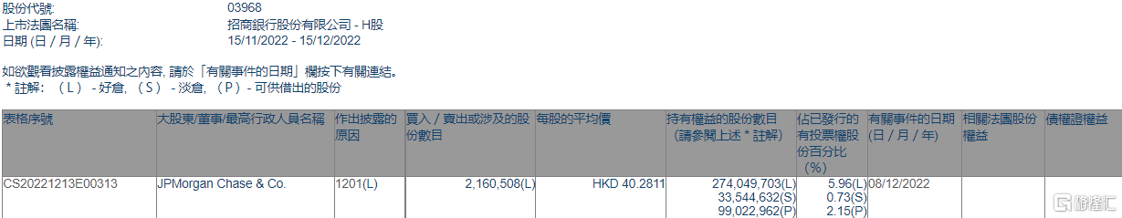 格隆汇12月15日丨根据联交所最新权益披露资料显示,2022年12月8日,招商银行(03968.HK)遭JPMorgan Chase & Co.以每股均价40.2811港元减持好仓216.05万股,涉资约8702.76万港元。