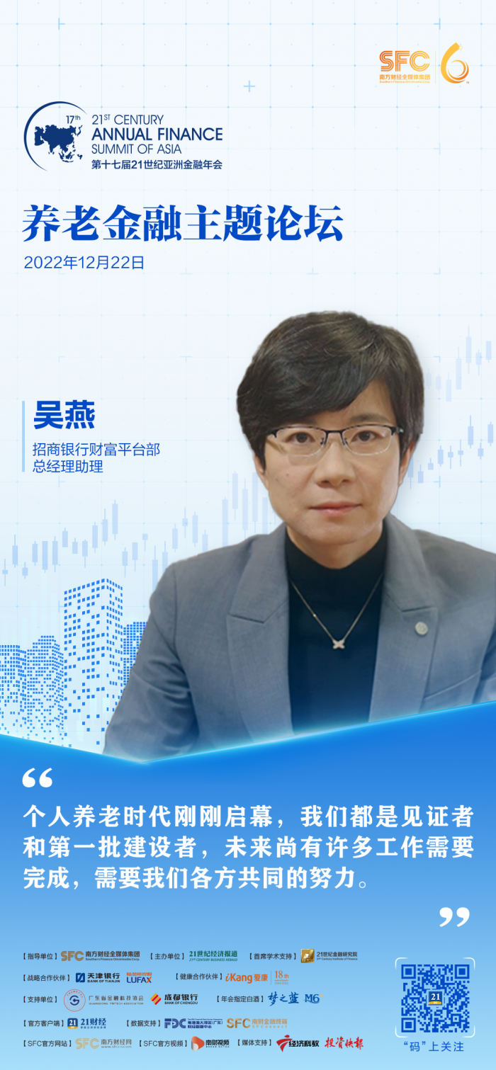 12月22日,第十七届亚洲金融年会“养老金融新动力”主题论坛召开,招商银行财富平台部总经理助理吴燕出席并做了“三位一体,以优质体验开启个人养老新征途”为主题的演讲。