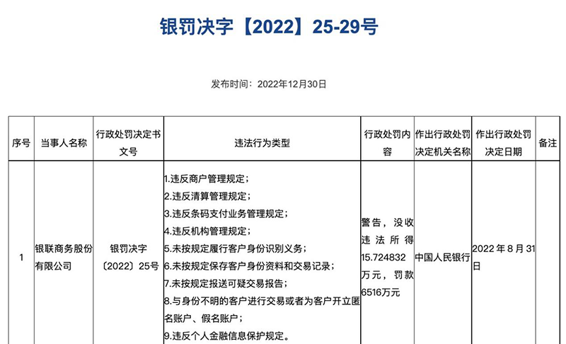 罚单信息显示,银联商务违反商户管理规定;违反清算管理规定;违反条码支付业务管理规定;违反机构管理规定;未按规定履行客户身份识别义务;未按规定保存客户身份资料和交易记录;未按规定报送可疑交易报告;与身份不明的客户进行交易或者为客户开立匿名账户、假名账户;违反个人金融信息保护规定。