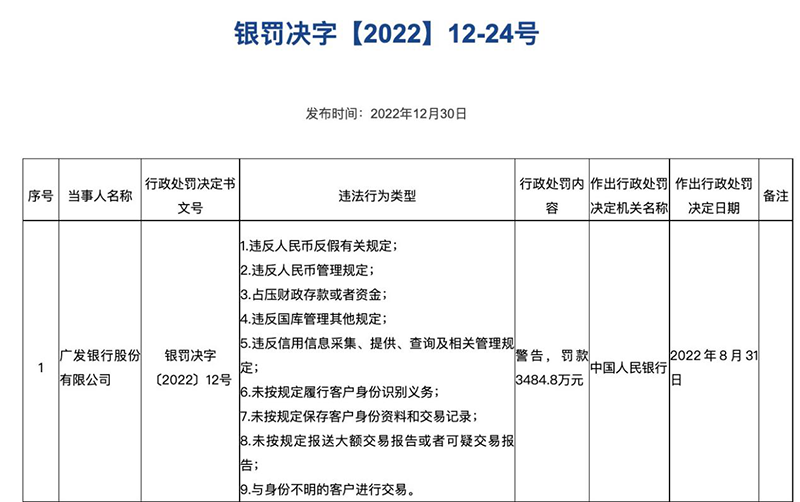 广发银行因9项案由被警告,罚款3484.8万元。广发银行另有12人被罚。