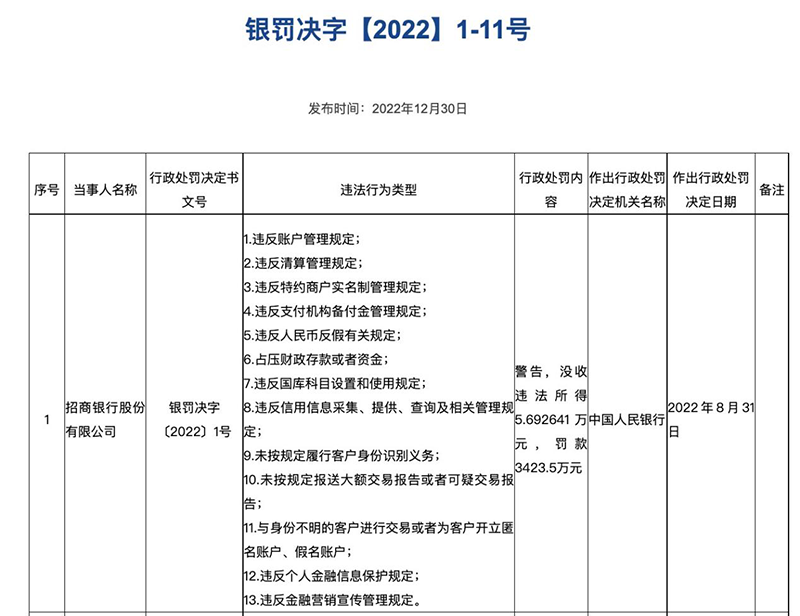 2022年的最后一个工作日,人民银行披露了一批8月底时作出行政处罚决定的罚单。招商银行、广发银行、银联商务合计被罚没约1.34亿元。