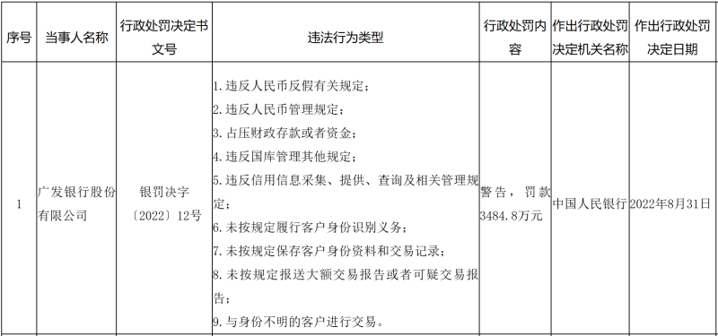广发银行由此被央行予以警告,罚款3484.8万元,12名相关负责人同时领罚。
