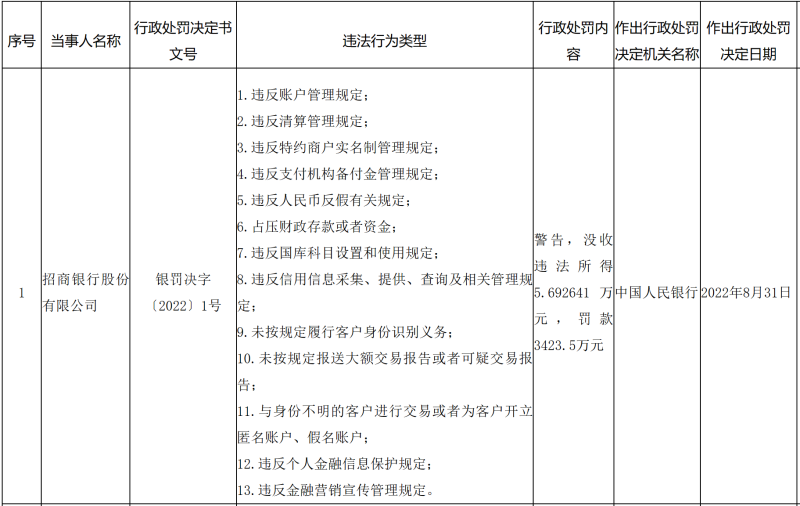 行政处罚决定书显示,招商银行涉及十三项违法行为类型。一是违反账户管理规定;二是违反清算管理规定;三是违反特约商户实名制管理规定;四是违反支付机构备付金管理规定;五是违反人民币反假有关规定;六是占压财政存款或者资金;七是违反国库科目设置和使用规定。