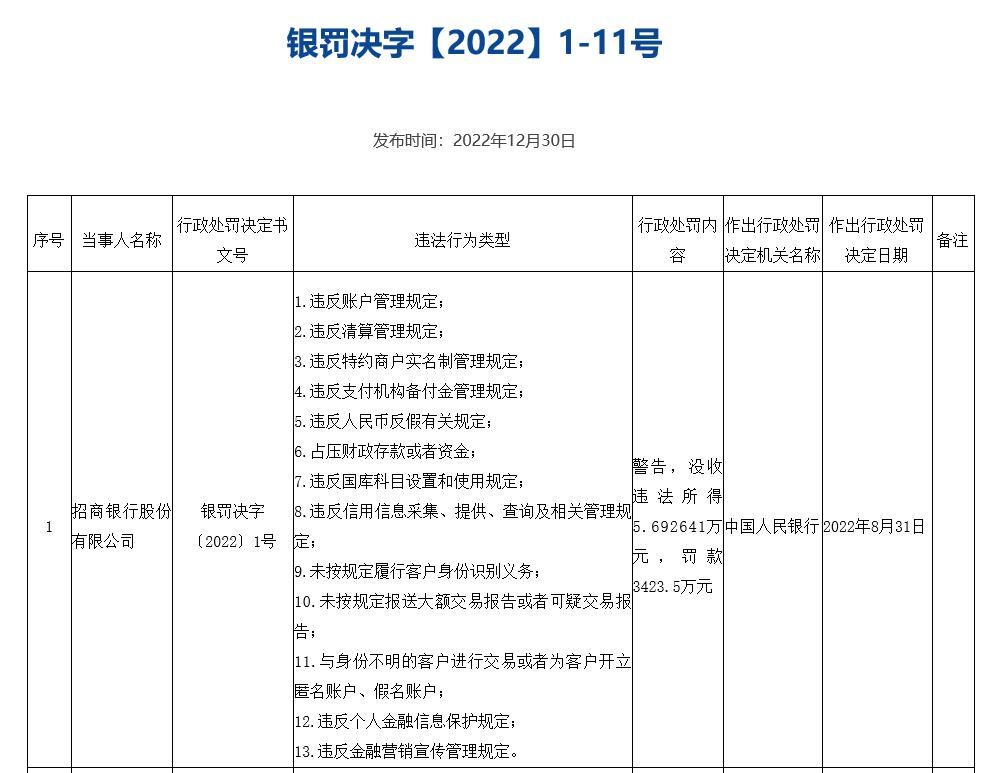 中国经济网北京1月1日讯央行网站近日公布的行政处罚公示(银罚决字【2022】1-11号)显示,招商银行股份有限公司存在13项违法行为类型,被中国人民银行警告,没收违法所得5.692641万元,罚款3423.5万元。
