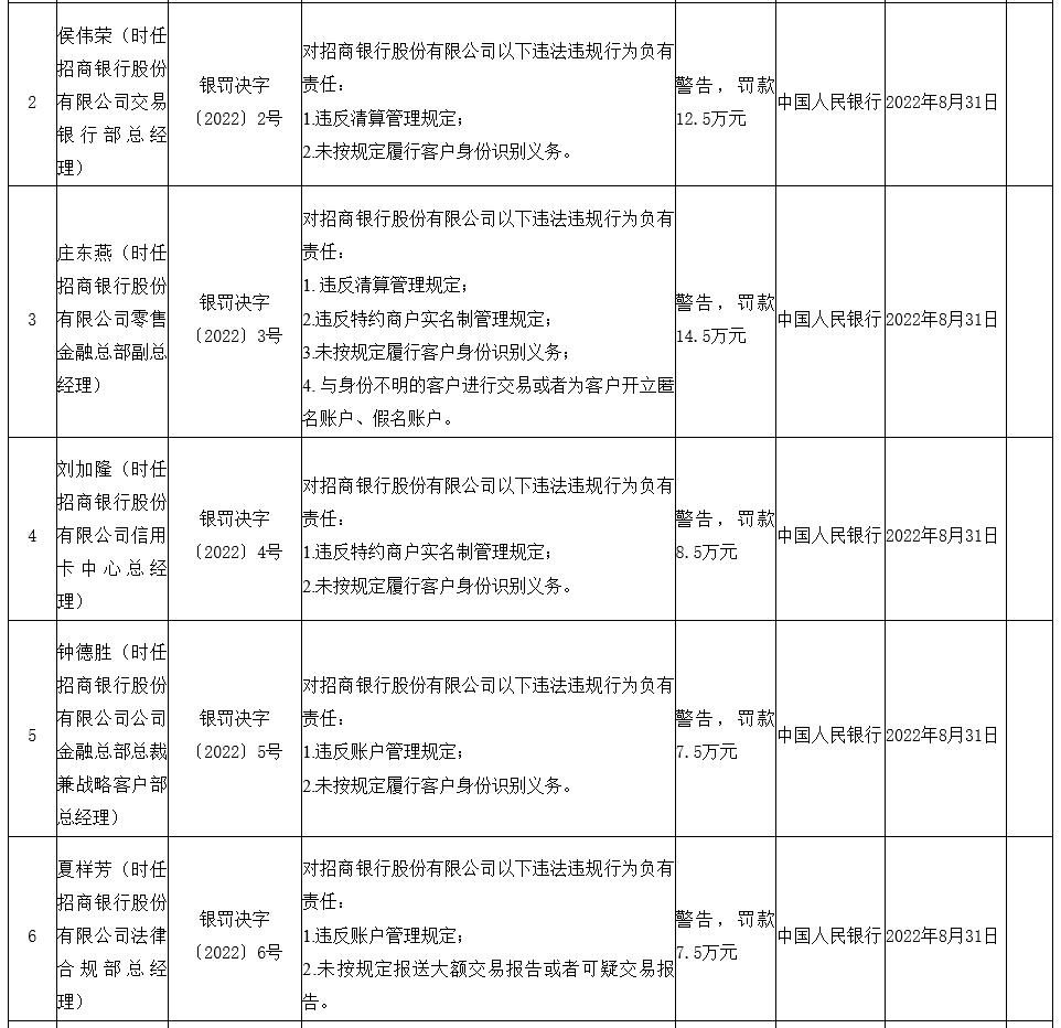 庄东燕(时任招商银行股份有限公司零售金融总部副总经理)对招商银行股份有限公司以下违法违规行为负有责任:1.违反清算管理规定;2.违反特约商户实名制管理规定;3.未按规定履行客户身份识别义务;4.与身份不明的客户进行交易或者为客户开立匿名账户、假名账户。中国人民银行对庄东燕警告,罚款14.5万元。