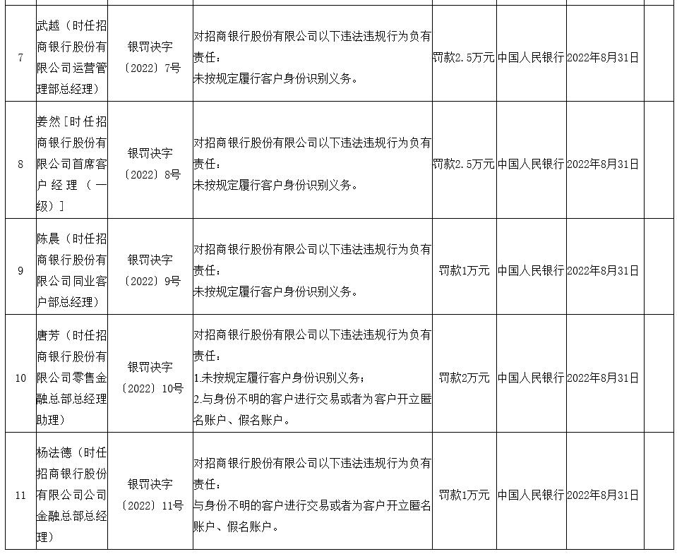 武越(时任招商银行股份有限公司运营管理部总经理)对招商银行股份有限公司以下违法违规行为负有责任:未按规定履行客户身份识别义务。中国人民银行对武越罚款2.5万元。
