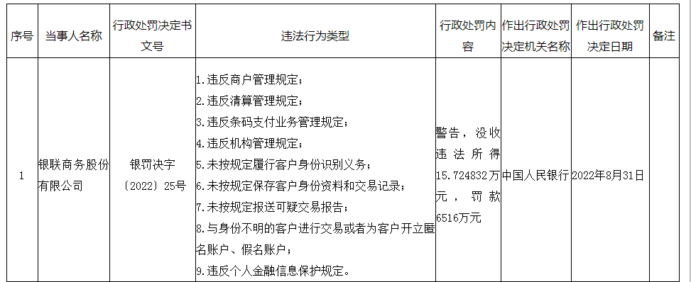 银联商务被予以警告,没收违法所得15.724832万,罚款6516万。另有4名当事人被罚,罚金5万至11.5万不等。