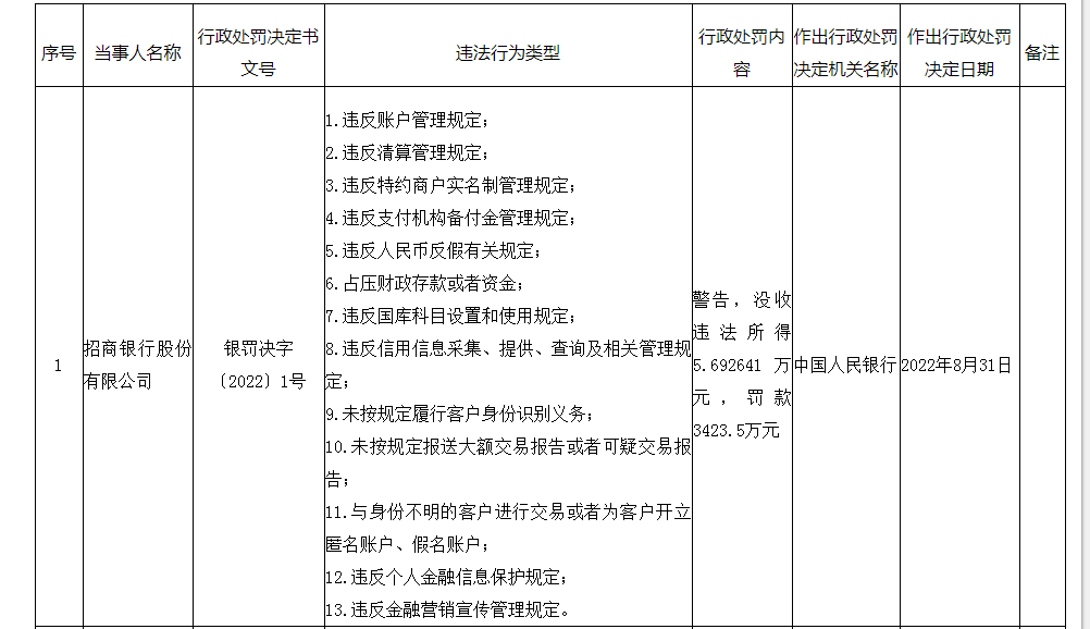 其中,招商银行被予以警告,没收违法所得5.692641万,罚款3423.5万。另有10名当事人被罚,罚金1万至14.5万不等。