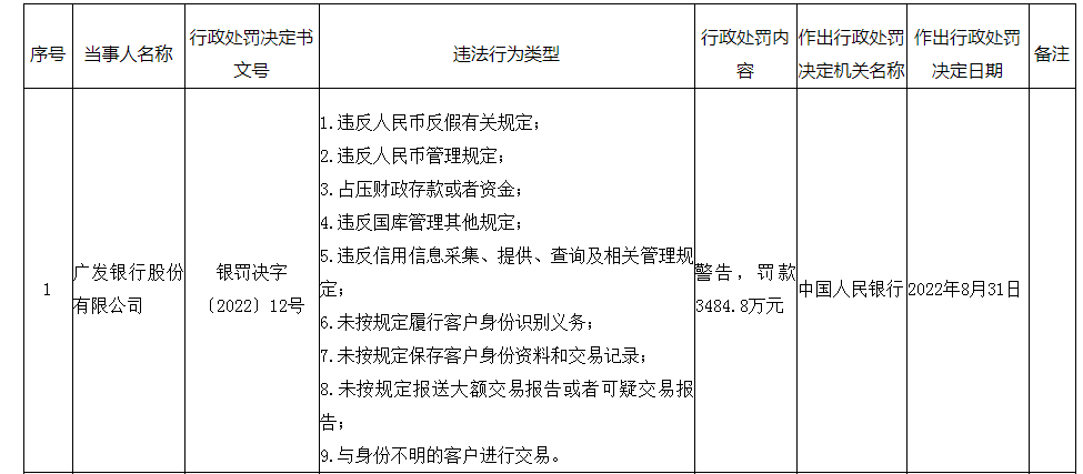广发银行被予以警告,罚款3484.8万。另有12名当事人被罚,罚金1万至9万不等。