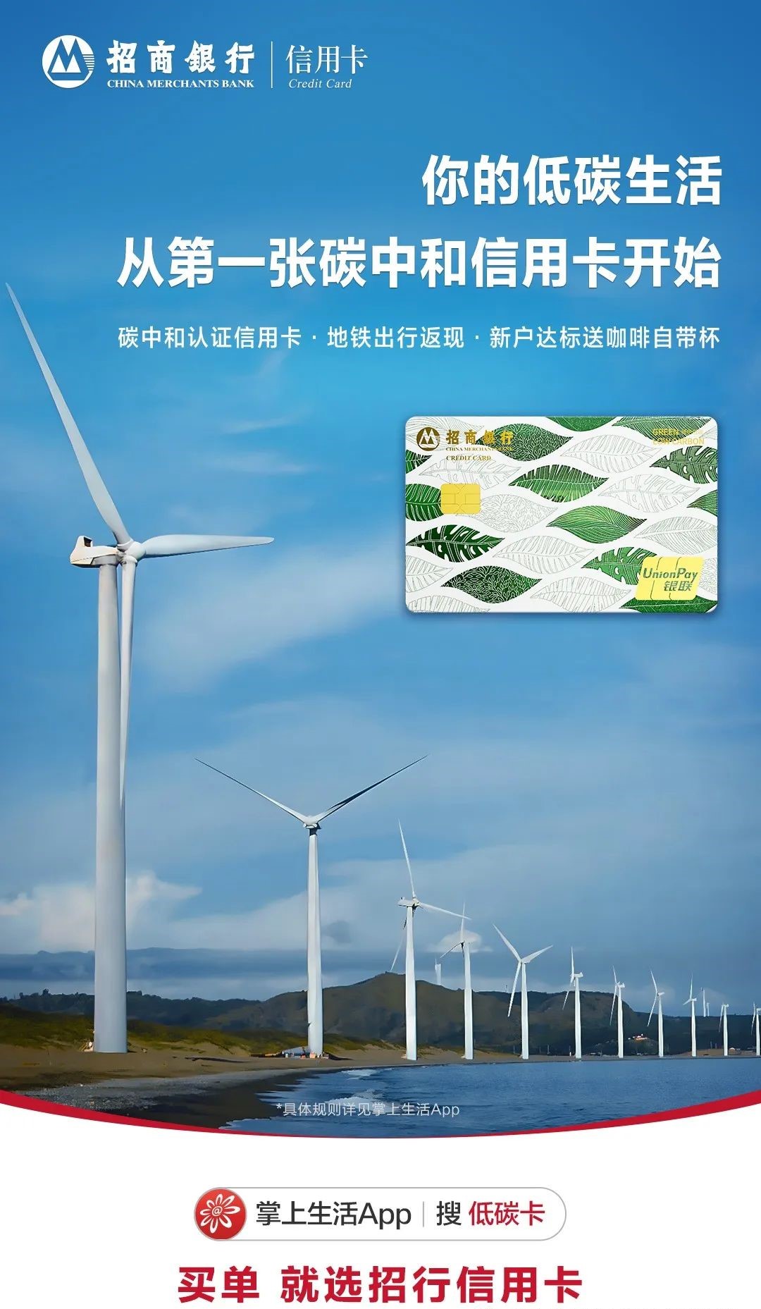 “低碳生活,从第一张碳中和信用卡开始。”招商银行信用卡推出“碳中和”信用卡,为倡导消费者的低碳生活,畅通低碳消费提供了新范式。未来,招商银行信用卡也将坚持长期主义,引领更多持卡人,践行绿色低碳之路,从消费端助力低碳转型。