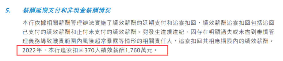 除此之外,渤海银行披露370人被追回1760万元。渤海银行在2021年年报中也披露依据相关薪酬管理办法实施了绩效薪酬延期支付、止付和追索扣回,不过没有披露相关数据。