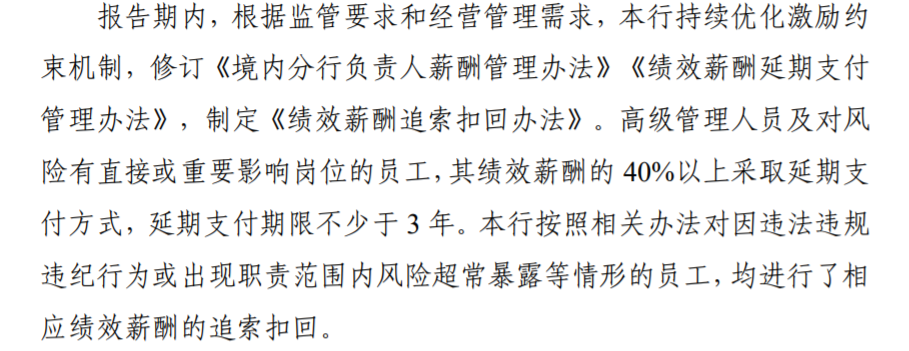 作为城商行的哈尔滨银行也在年报中披露对高级管理人员及对风险有重要影响岗位的员工,实行延期支付和锁定支付期限,同时,对于因存在明显过失或未尽到审慎管理义务,导致职责范围内风险超常暴露的高级管理人员和关键岗位人员,本行对其相应期限内的绩效薪酬进行追索扣回。