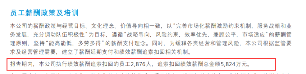 “招商银行披露去年2876名员工被追索扣回绩效薪酬总金额5824万,渤海银行披露370人被追回1760万元,根据监管层披露消息,95%以上机构已制定并实施了绩效薪酬延期支付和追索扣回制度。”