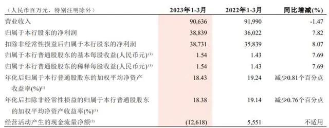 日前,招商银行发布2023年一季报,数据显示,今年1-3月,招商银行实现营业收入906.36亿元,同比下降1.47%;实现归属于股东的净利润388.39亿元,同比增长7.82%。