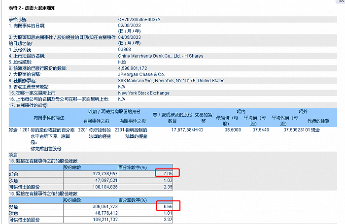招商银行:摩根大通持股比例降至6.66%