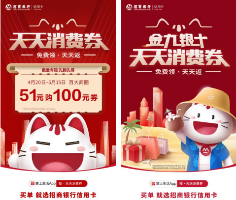 此外,五一、十一小长假等节日假期,招商银行信用卡也把握住消费热点,推出“天天消费券”活动。通过发放商圈、商户消费券等形式帮助线下商家提高销售转化率,为经济复苏和消费增长提供有力支持。