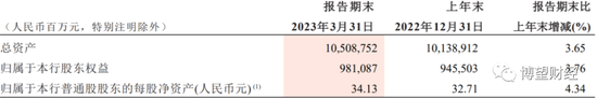 截至2023年3月末,招商银行资产总额105,087.52亿元,较上年末增长3.65%;贷款和垫款总额63,359.75亿元,较上年末增长4.70%;负债总额95,189.90亿元,较上年末增长3.64%;客户存款总额77,718.78亿元,较上年末增长3.13%。