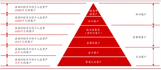 面对如此体量客户,亟需明确经营重心,于是在2004年顺势面向5-50万客户推出金卡,第一次进行了客户细分,后又于2007年推出专为资产在1000万以上的高端客户提供理财服务的私人银行,瞄准高净值和富豪阶层,2009年进一步细分,面向金融资产在500万元-1000万元客户,推出金葵花钻石卡。至此形成了包括金葵花、金葵花钻石、私人银行在内的中高端客户分层管理体系,针对不同财富阶层的客户提供差异化服务,如下图: